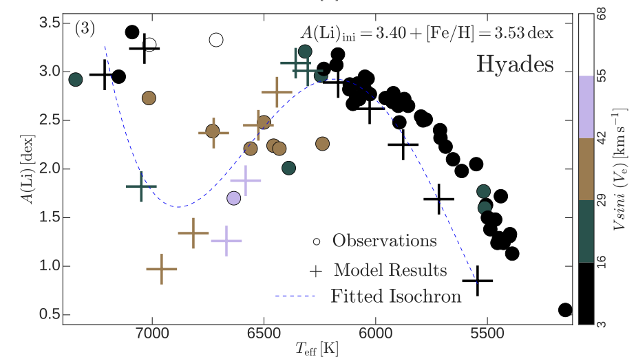 图2: 毕星团成员星锂丰度与有效温度。圆点是观测样本,线条是模型结果的等年龄拟合线。