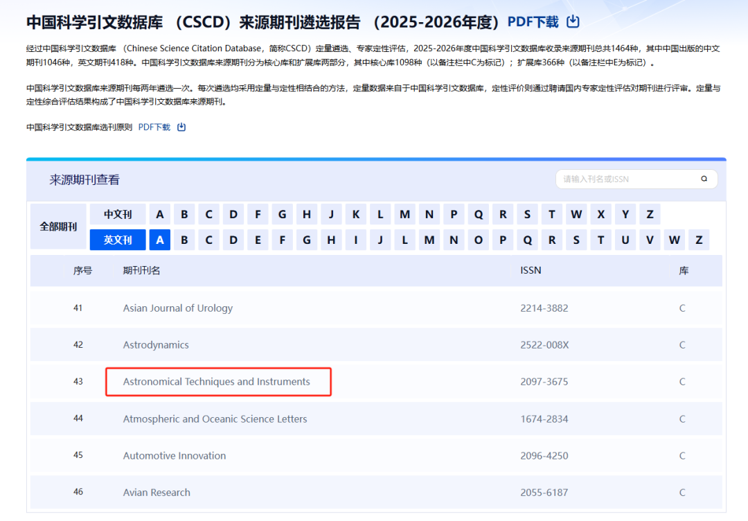 此次评选中,《Astronomical Techniques and Instruments》入选中国科学引文数据库(CSCD)核心库。