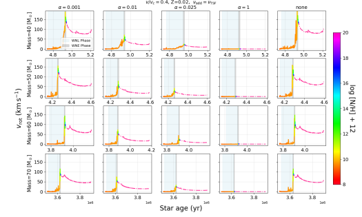 图1 :大质量恒星模型在核心氦燃烧阶段表面速度的演化。不同曲线表示在对流包层底部激发的重力内波强度的差异,由参数A控制。颜色代表表面氮丰度;蓝色与灰色阴影区域分别对应WNL 和 WNE 阶段。氢完全剥离后的演化轨迹以粉色点划线显示。