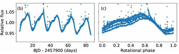图2. 一颗自转周期为16.5天的活动UCD的原始(左)与位相折叠(右)光变曲线。光球黑子活动导致其亮度呈现自转调制变化。